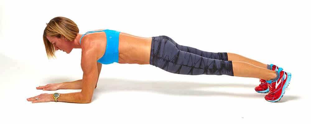 Trainer translation: It’s all about alignment. Whether you’re doing a plank or a push-up, you want to make sure your entire body from the top of your head to your tailbone is aligned. When we press our chin forward, we’re creating much tension in our neck and upper back.