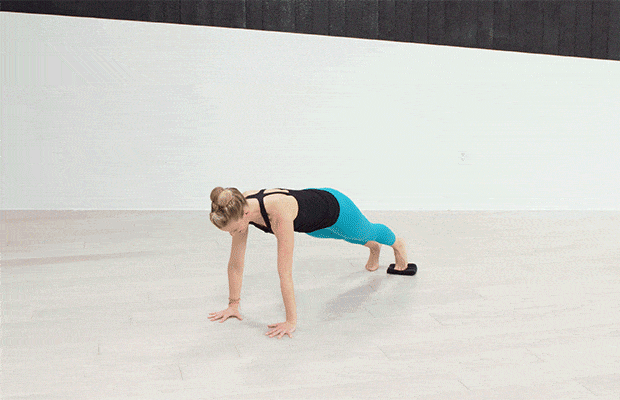 How to: Start in a high plank position, shoulders over wrists and forming a straight line from shoulders to ankles. Both feet should be on gliders, with legs together