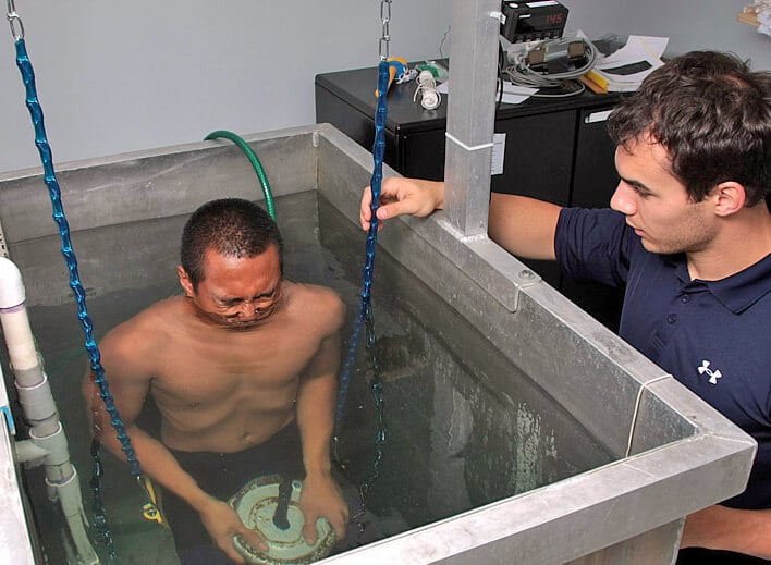 If the thought of getting dunked underwater suits your fancy, this might be the method for you. Hydrostatic weighing, commonly referred to as underwater weighing, compares a subject’s normal bodyweight (outside the water) to someone’s bodyweight while wholly submerged.